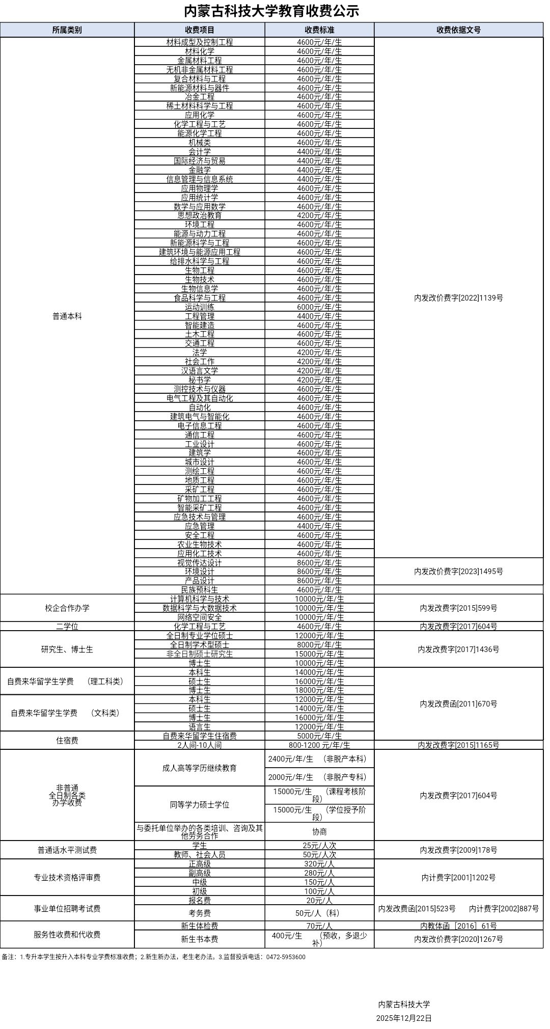 内蒙古科技大学教育收费公示